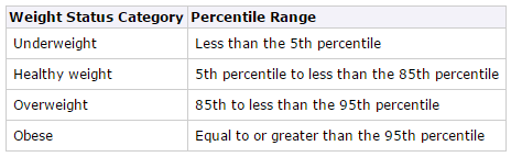 BMI-for-age weight status categories and the corresponding percentiles are shown in the following table.