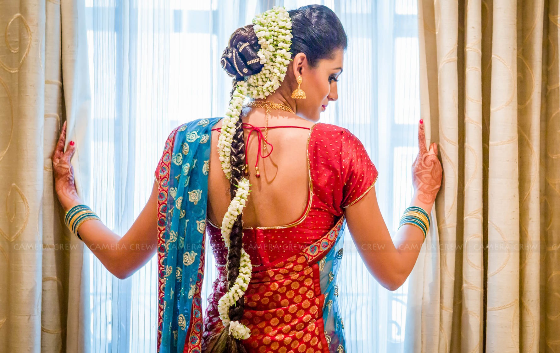 Her choice of rust orange and blue compliments the gold in her minimal bridal jewellery perfectly. What steals the show is her gorgeous muthu jadai and the floral arrangement on her hair!