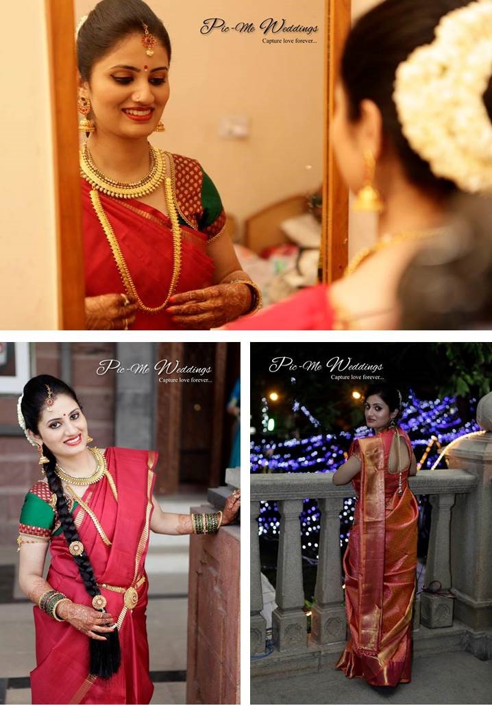 Pavithra chose a lovely rani pink and cream Kanjeevaram saree with beautifully done embroidery on the blouse to balance out the light tone. Her layered necklaces certainly make a statement, standing out against the cream silk background.